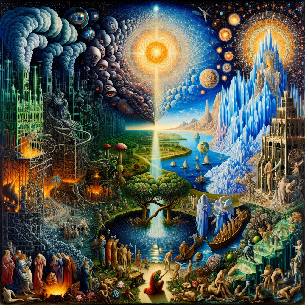 These 8 tokens—launched on pump.fun, the Solana memecoin launchpad—represent fundamental human concerns: environmental collapse, existential threats, technological dominance, fear, and hope. As their market caps shift, the emotions they represent flow into the painting. When FEAR rises, shadows deepen. When HOPE climbs, light breaks through. When NUKE spikes, the canvas erupts in radioactive glow.